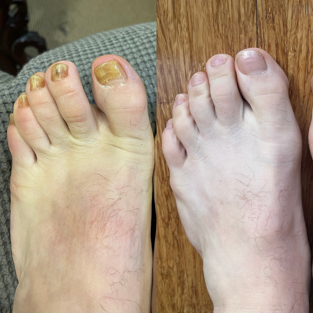 Our system is different. The Nail Rescue Max removes those thick, discolored, brittle layers (which are basically dead and infected), and then the FixaNail™ serum can actually penetrate down to where the fungus lives.